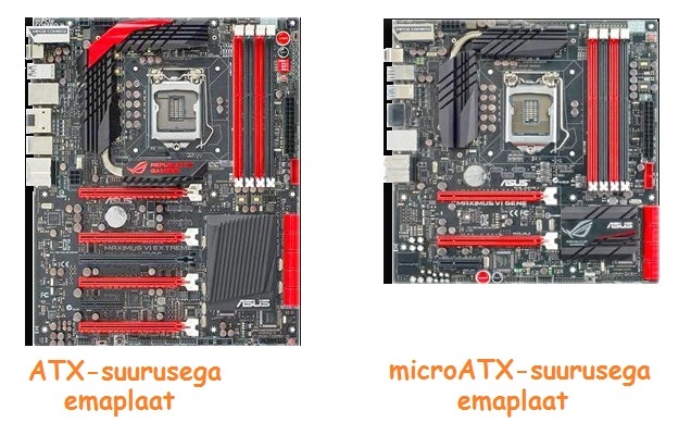 ATX microATXkaasaegse PC-arvuti emaplaadid on enamasti kahe suurusega, mida nimetatakse: ATX ja microATX lisaks neile on suuruseid veelgi, kuid need 2 on levinumad. lühend tähendab väheütlevalt : ATX — Advanced Technology eXtended emaplaat kinnitub korpuse põhja külge kinnituskruvidega, kusjuures kinnituskohad on (nii korpusel kui ka plaadil) kindlates standardsetes asukohtades; "väiksematesse" korpustesse mahuvad ainult microATX-emaplaadid : sellised väiksemad plaadid on tavaliselt odavamates arvutites; ATX-emaplaadid mahuvad ainult "suurematesse" korpustesse; kuhu korpusesse mahub ATX-emaplaat, sinna mahub / sobib ka microATX emaplaat; FOTO: ATX ja microATX emaplaatide kuju / suurus võrdlevalt | |