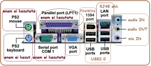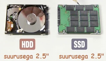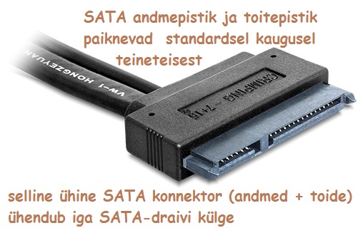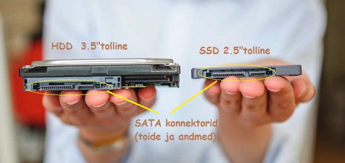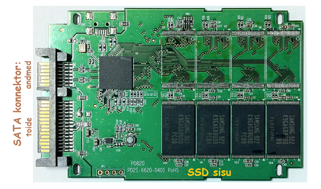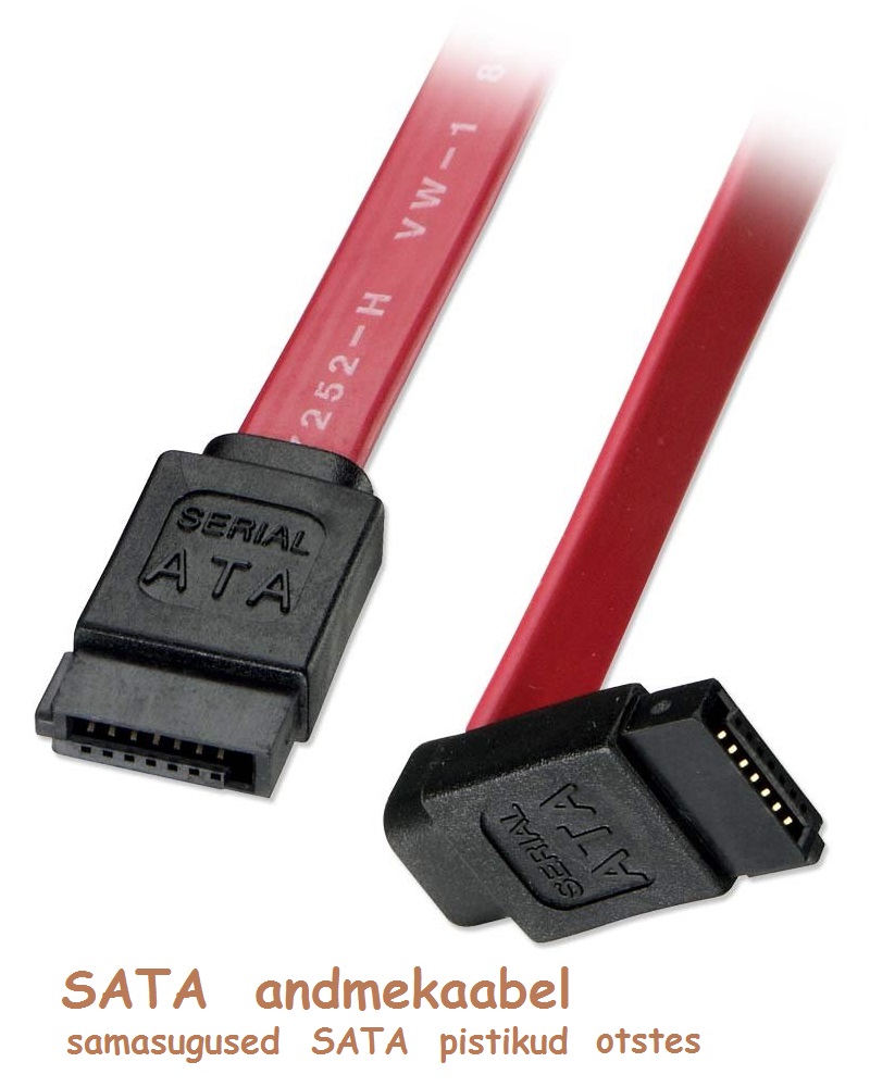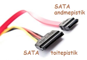 kettaseade kõvaketasHDD — Hard Disk DriveSSD — Solid State Drive SATA — Serial Advanced Technology Attachment Erinevalt põhimälust ei vaja ketasmälu andmete hoidmiseks elektrienergiat. Arvutiajaloo jooksul on olnud ketasmäluks kõvaketas, mis sisaldab pöörlevaid metallist (magnet)kettaid ja lugemispäid. Kõvakettad on osaliselt asendumas uut tüüpi mäluseadmetega/salvestusseadmetega, mis arvuti jaoks "paistavad" tavaliste kõvaketastena, kuid mis tegelikult ei sisalda "kettaid" ehk pöörlevaid koostisosi - ega ei sisalda üldse liikuvaid osi. Neid nimetatakse SSD-(ketta)seadmeteks. Kuna nad on arvutis samas rollis mis seni olid kõvakettad ( Hard Disk Drive ), siis nimetatakse ka SSD-(salvestus)seadmeid endiselt "kettaseadmeteks" (drive; "draiv") — kuigi nad "kettaid" tegelikult ei sisalda. Arvuti sisselülitamisel loetakse/laaditakse HDD või SSD pealt põhimällu (RAM) tööle arvuti tähtsaim tarkvara ehk operatsioonisüsteem — milleks on PC-arvutil harjumuspäraselt Windows, harvem ka Linux. Kõik arvuti töötulemused (ehk andmed) tuleb samuti kirjutada põhimälust ära ketasmälu ehk "draivi" peale — kas SSD või HDD peale. Muidu läheksid andmed arvuti sulgemisel lihtsalt kaduma. SSD-kettaseadmetel ja kõvaketastel (HDD) on järgevad erinevused: — SSD lugemiskiirus ja kirjutamiskiirus (kettaseadmelt mällu ja vastupidi) on kiirem kui HDD kiirus; — HDD maht/andmemahtuvus on suurem kui SSD maht; — SSD hind ("mälumahu ühiku kohta") on suurem/kallim kui HDD hind; — HDD on palju rohkem ohustatud põrutuste poolt kui SSD; — SSD üldine töökindlus on parem kui HDD töökindlus; — SSD energiatarbimine on väiksem kui HDD energiatarve; Tulevikus SSD-draivide mahtuvus kasvab ja hind väheneb, misjuhul nad hakkavad (laiatarbearvutites) üha rohkem asendama kõvakettaid. SSD-draiviga sülearvuti on töökindlam kui HDD-draiviga, kuna sülearvutil võib sageli juhtuda põrutusi. HDD põhikasutuseks jääb suurte andmemahtude salvestamine/hoidmine: andmebaasid, serverid, multimeediasisu arhiveerimine (heli ja video) . . . HDD-kettaseadmete/draivide standardne suurus on laius 3.5 tolli (3.5") ja nad paigaldatakse arvutikorpuse 3.5-tolliste seadmete kinnituskohta. SSD-draivide standardne suurus on laius 2.5 tolli (2.5") ja nad paigaldatakse arvutikorpuse 2.5-tolliste seadmete kinnituskohta. Sülearvutite jaoks on olemas ka väiksed HDD kettad laiusega 2.5" nii HDD kui ka SSD kaasaegsed kettaseadmed ühendatakse emaplaadi külge SATA kaabelliidese kaudu. SATA kaabelliidesel on eraldi pistik andmete jaoks ja eraldi pistik toite jaoks; SATA andmekaabel ühendab seadet ja emaplaati; SATA toitekaabel ühendab seadet ja toiteplokki; FOTOD: kettaseadmed ehk "draivid" HDD : SSD-draivid : SATA konnektorid: pistikud ja pesad emaplaadil | ![]() |