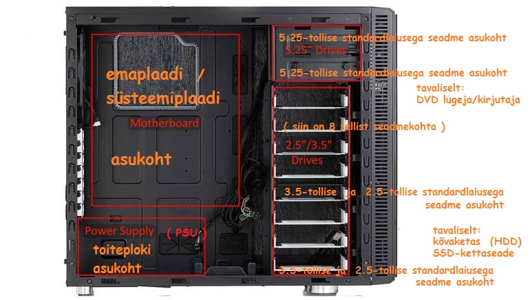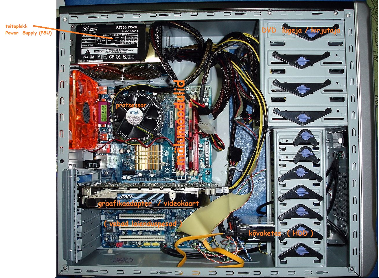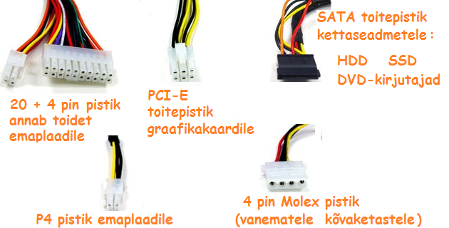 toiteplokkPSU — Power SupplyToiteplokk vahendab elektritoidet kõikidele arvutikomponentidele 5 erineva pistikutüübi kaudu. Toiteploki tähtsaim karakteristik on tema võimsus (W). Kaasaegsele laiatarbearvutile piisab toiteplokist võimsusvahemikus 400 W . . . 600 W Suure jõudlusega PC-arvutid võivad vajada ka üle 650 W toiteplokki. Erinevad kaablivärvid tähendavad erinevaid toitepingeid: kollane : +12 V punane : +5 V oranz : +3.3 V must : 0 [maandus] Nagu on näha arvutikorpuse sisu näitavatel kõikidel eelnenud piltidel: toiteplokk asub tower-korpuse allosas "põhjas" kõige alumisena või (enamikes korpustes siiski:) tower-korpuse ülaosas "laes" kõige ülemisena. Kui arvuti ei stardi tööle tavalisest nupuvajutusest, siis esimesena tasub proovida toitekaabli (C13) lahtiühendamist toiteploki küljest mõneks sekundiks. Elektrivõrgu toitekaabli taasühendamine toiteploki külge võib toiteploki taastada normaalsesse seisundisse, misjärel arvuti sisselülitamisnupp (korpuse küljes) hakkab jälle toimima. Kui selle võtte järel arvuti ikkagi ei stardi, siis on tal tõsisem rike. Kui arvuti ei tööta (ei stardi tööle nupuvajutusest) mistahes arusaamatul põhjusel, siis viga otsides tasub esimesena proovida just toiteploki äravahetamist: toiteploki rike on kõige sagedasem arvutirike. Toiteplokil on tagaküljel ka täiendav lüliti I/0, mis ühendab-katkestab arvutit vooluvõrgust. FOTOD: toiteplokid : komponentide toitepistikud : | |