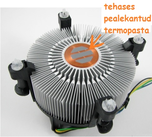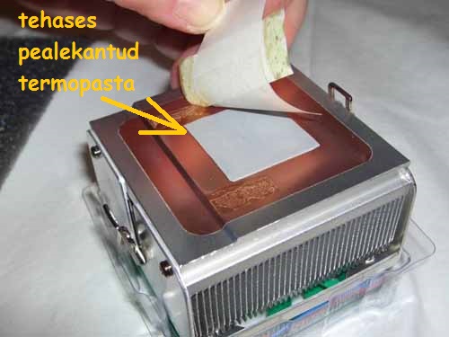 protsessori jahutusradiaator( heat sink )Protsessori töötamisel eraldub tema mikroskeemis palju soojust. Protsessor on arvestatud töötama ainult koos jahutusradiaatoriga, mis paigaldatakse tihedalt ja piisava survejõuga vastu protsessorit. Protsessori ja radiaatori vahel peab olema hea soojusjuhtivusega termopasta (thermal grease). Kui protsessor on juba tehases komplekteeritud sobiva radiaatoriga, siis sellises komplektis tarnitaval radiaatoril on termopasta tavaliselt juba tehases pealekantud — misjuhul tehnik / monteerija / paigaldaja ei pea termopasta pealekandmise pärast muretsema. Ilma termopastata ei ole ühendus protsessori ja radiaatori vahel mitte kunagi piisava soojusjuhtivusega — tugeva survejõu korral kah mitte. Paigaldades radiaatori protsessori peale ilma termopastata, kuumeneb protsessor üle juba mõne minutiga. Tehases eel-pealekantud termopasta mõnikord ei kata radiaatorit kohe "ühtlase kihina" — vaid "sulab" ühtlaselt laiali alles oma esimesel kuumenemisel. FOTOD: tehases pealekantud termopastaga radiaatorid : radiaatorid : termopasta : | |